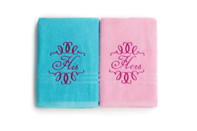 Blue and pink towels with decorative “His” and “Hers” embroidery on pastel background