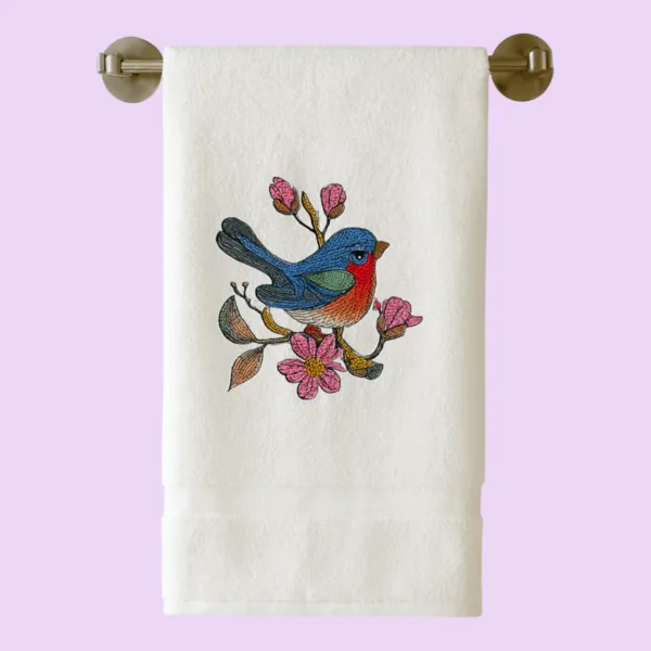 White towel hanging on rail with blue and red bird embroidery perched on pink flowers