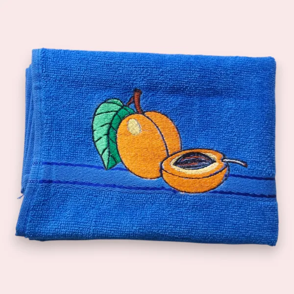 Blue cotton towel with embroidered apricot fruit and leaf design