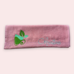 Pink cotton towel with embroidered red apple and green leaves design