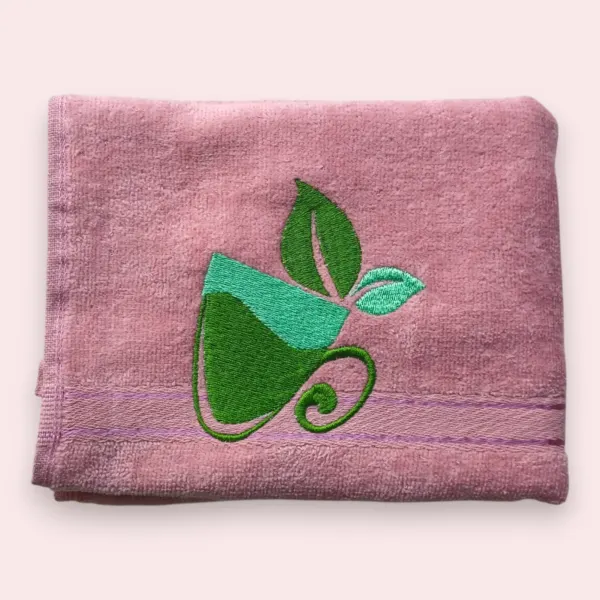 Pink cotton towel with green tea cup and leaf embroidery design