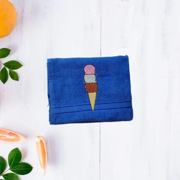 Blue cotton towel with embroidered triple scoop ice cream cone design