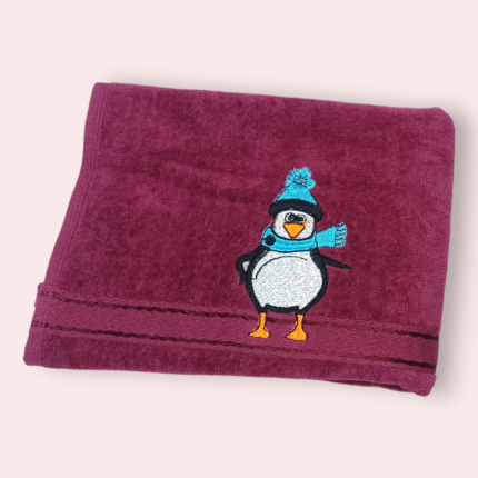 Maroon kids towel with cute winter penguin embroidery in blue hat and scarf