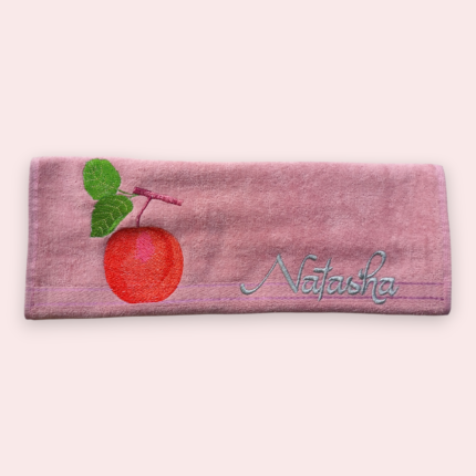 Pink cotton towel with embroidered red apple and green leaves design