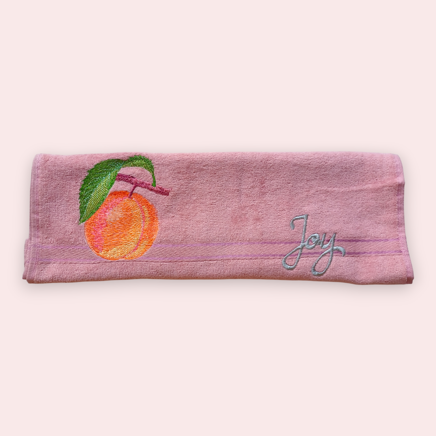 Pink cotton towel with embroidered orange fruit and green leaf design