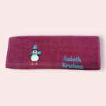 Maroon kids towel with cute winter penguin embroidery in blue hat and scarf