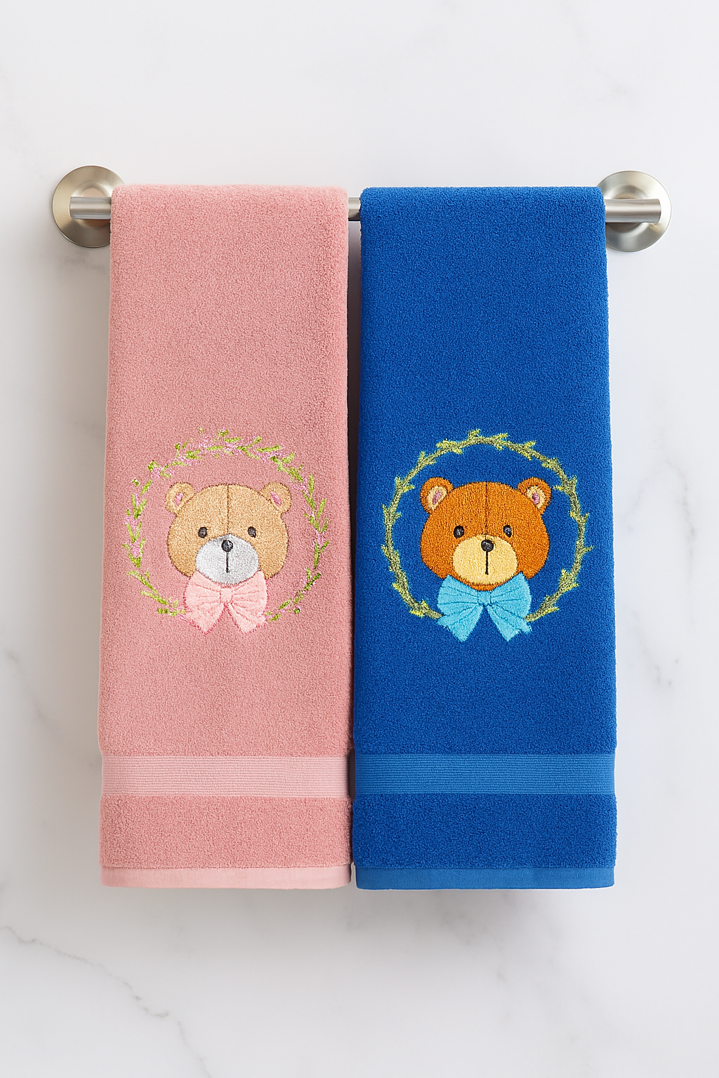 Pink and blue towels with cute bear faces and bows embroidered inside leaf wreaths on pastel background