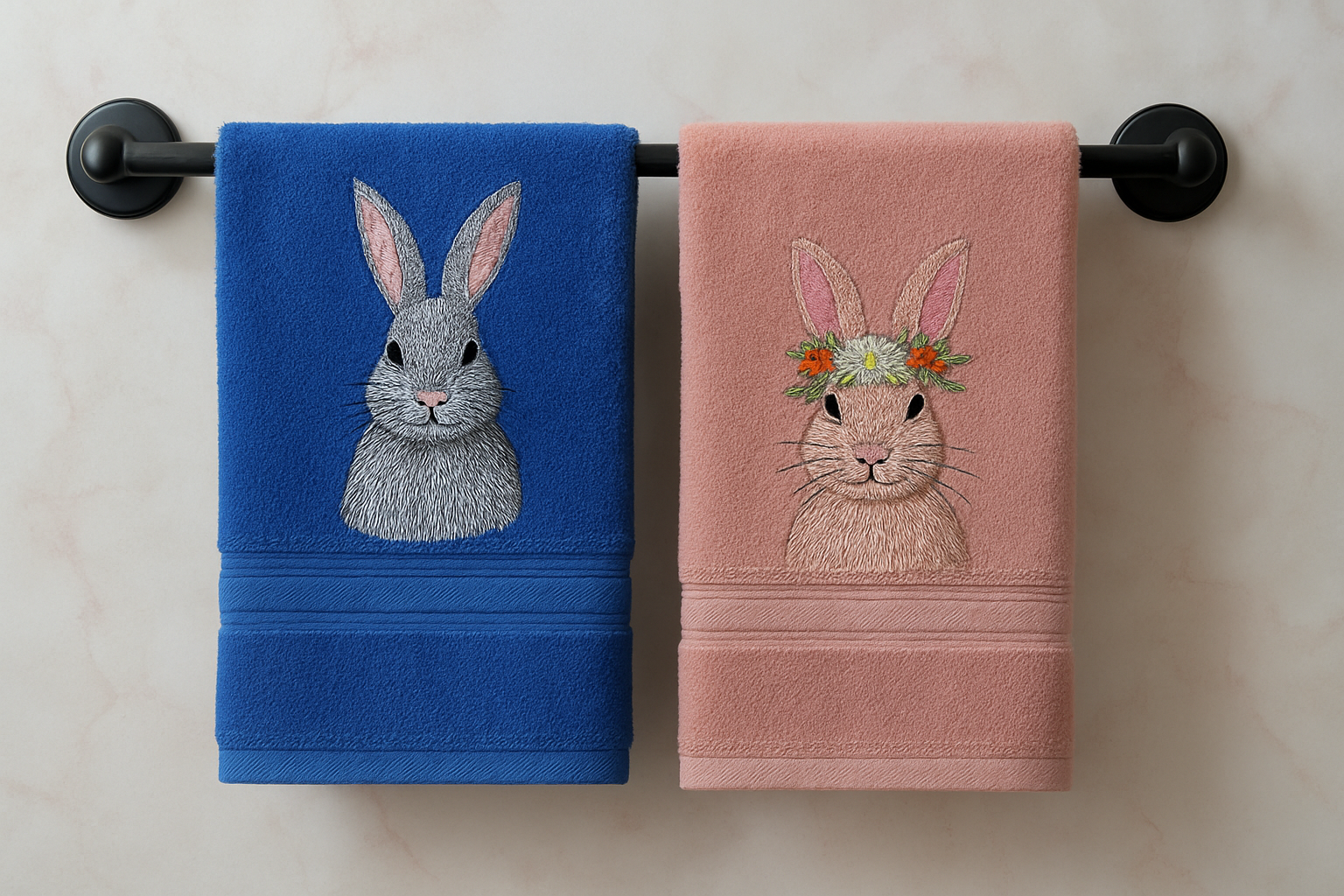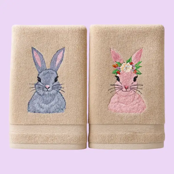 Beige towels with grey bunny and pink bunny with flower crown embroidery on pastel background